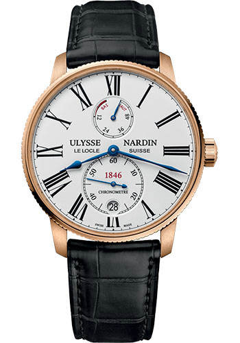42 mm 18K rose gold case, screw-down security crown, sapphire crystal, black dial, Caliber UN-118 self-winding movement with COSC and Ulysse Nardin performance certificate, 60 hours power reserve indicator, oversized seconds-hand, date, silicium and diamonsil technology, leather strap, folding buckle. Water resistant to 50m.