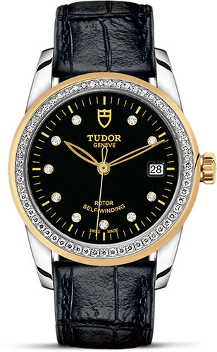 36 mm polished finished steel case, yellow gold screw-down crown with the tudor logo, polished steel and yellow gold double bezel set with 60 diamonds and, sapphire crystal, black dial with 10 diamonds, cut-out feuille hands, date at 3 o’clock, Calibre 2824 self-winding movement, approximately 38 hours of power reserve, black leather strap, folding buckle. Water resistant to 100 m (330 ft).