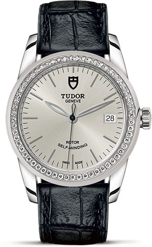 36 mm polished finished steel case, steel screw-down crown with the tudor logo, polished steel double bezel set with 60 diamonds and, sapphire crystal, silver dial with 10 diamonds, cut-out feuille hands, date at 3 o’clock, Calibre 2824 self-winding movement, approximately 38 hours of power reserve, black leather strap, folding buckle. Water resistant to 100 m (330 ft).