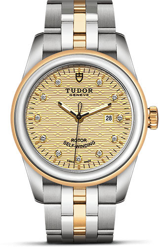 31 mm polished finished steel case, yellow gold screw-down crown with the tudor logo, polished steel and yellow gold double bezel, sapphire crystal, champagne-colour dial with 11 diamonds and date at 3 o’clock, Calibre 2671 self-winding movement, approximately 38 hours of power reserve, steel and yellow gold bracelet, folding buckle with safety catch. Water resistant to 100 m (330 ft).