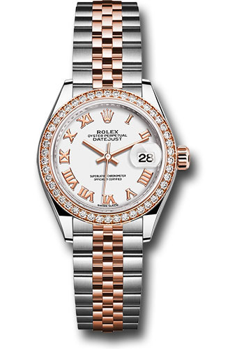 28mm Everose Rolesor case comprised of a 904L steel monobloc middle case, screw-down steel back, 18K Everose gold screw-down crown with twinlock double waterproofness system, 18K Everose gold diamond bezel, scratch-resistant sapphire crystal with cyclops lens over the date and double anti-reflective coating, white dial, Roman numerals, Rolex calibre 2236 automatic movement with center hour, minute and seconds hands, instantaneous date with rapid setting, and stop-seconds for precise time setting, Everose Rolesor Jubilee bracelet comprised of a combination of 904L steel and 18K Everose gold in five-piece links, concealed folding Crownclasp buckle. Waterproof to 100 meters.