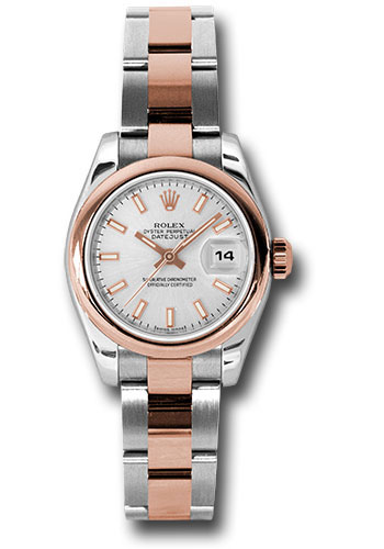 26mm stainless steel case, 18K pink gold domed bezel, silver dial, index hour markers, and stainless steel and 18K pink gold Oyster bracelet.