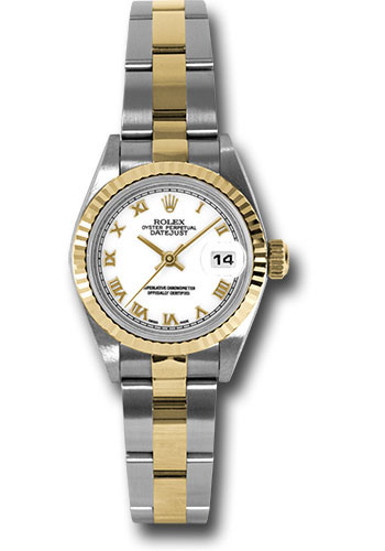 26mm stainless steel case, 18K yellow gold fluted bezel, white dial, Roman numerals, and stainless steel and 18K yellow gold Oyster bracelet.