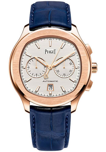 42 mm 18K rose gold case, 11.2 mm thick, satin-finished and polished bezel, white dial, 1160P automatic mechanical movement with hours, minutes, minutes counter at 3 o'clock (30 minutes), date at 6 o'clock, chronograph with central seconds, 12 hours counter at 9 o'clock, approximately 50 hours of power reserve, blue alligator strap, folding buckle. Water resistant to 10 ATM.