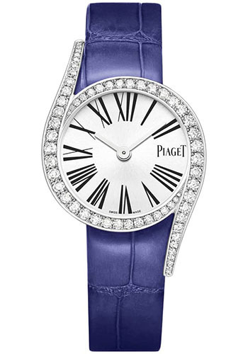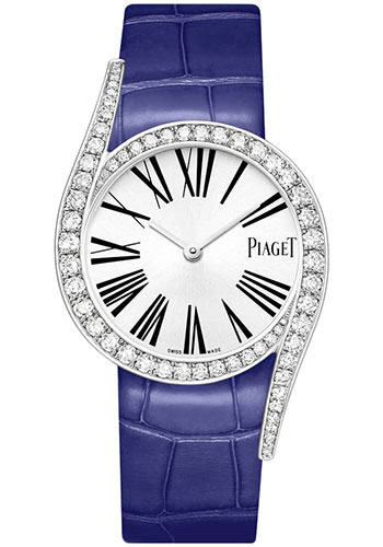 32 mm 18K white gold case set with 62 brilliant-cut diamonds (approx. 1.8 ct), 7.4 mm thick, bezel set with a line of graduated round diamonds, silvered dial, quartz movement, blue alligator strap, ardillon buckle. Water resistant to 03 ATM.
