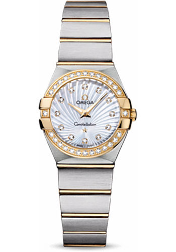 24 mm brushed stainless steel and 18K yellow gold case, diamond bezel, domed scratch-resistant sapphire crystal with anti-reflective treatment inside, white mother-of-pearl shell dial with diamond hour markers, quartz Omega 1376 movement, approximately 32 months of power reserve, stainless steel and 18K yellow gold bracelet. Water resistant to 100 m.