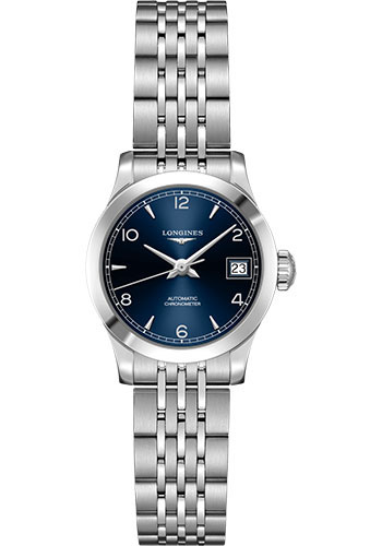 26.00 mm stainless steel case, transparent sapphire crystal back, scratch-resistant sapphire crystal with anti-reflective coating, sunray blue dial with painted Arabic numerals and applied indexes, caliber L592.4 automatic movement with hours, minutes, seconds and date, approximately 40 hours of power reserve, stainless steel bracelet. Water resistant to 3 bar.