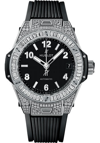 33 mm polished stainless steel case set with 130 diamonds for 0.4ct, polished stainless steel bezel set with 36 diamonds for 0.76ct, sapphire crystal with anti-reflective treatment, matte black dial, HUB1120 self-winding movement, approximately 40 hours of power reserve, black structured lined rubber strap, stainless steel deployant buckle. Water resistant to 100m (10 ATM).