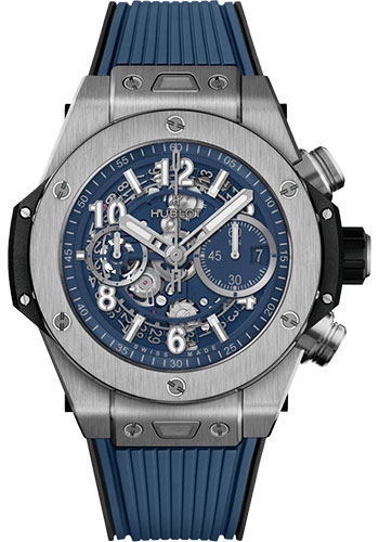 44 mm satin-finished and polished titanium case, satin-finished and polished titanium bezel with 6 h-shaped titanium screws, sapphire crystal with anti-reflective treatment, mat blue skeleton dial, HUB1280 UNICO manufacture self-winding chronograph flyback movement, approximately 72 hours of power reserve, blue structured lined rubber strap, titanium deployant buckle. Water resistant to 100m (10 ATM).