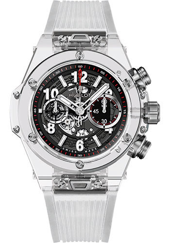 45 mm polished blue sapphire crystal case, polished 18K white gold bezel polished 18k white gold set with 48 baguette-cut blue sapphires and 6 H-shaped titanium screws, sapphire crystal with anti-reflective treatment, polished and smoked transparent composite resin skeleton dial, HUB1242 UNICO self-winding movement with flyback chronograph and column wheel, approximately 72 hours of power reserve, blue transparent structured lined straps structured lined rubber strap, titanium deployant buckle. Water resistant to 100 meters.