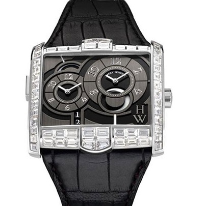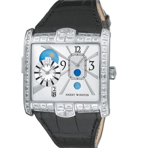 36.2 mm x 37.4 mm 18K white gold case set with diamonds (5.34 carat), white mother of pearl dial with diamonds, double quartz movement with independent displays for two time zones, white satin strap.
