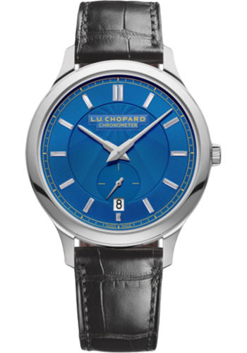 42mm stainless steel case, 10.64mm thick, with see-through sapphire crystal back, stainless steel crown screw down, sapphire crystal, silver dial with luminescent hands and Roman numerals, L.U.C 01.01-L automatic movement with stop seconds, hours, minutes, seconds and date, approximately 60 hours of power reserve, black alligator strap with hand sewn matching tones, stainless steel pin buckle. Water resistant to 100 meters.
