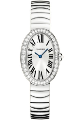 Small size (28.6mm) 18K white gold case set with diamonds, silver opaline dial with Roman numerals, quartz Cartier calibre 057 movement, 18K white gold bracelet set with diamonds. Water resistant to 30 meters.