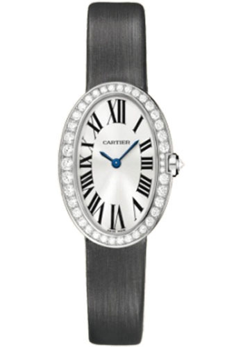 Small (31.6mm x 24.5mm) 18K white gold case set with round diamonds, silvered dial with sun-like finish, quartz Cartier calibre 057 movement, fabric strap with 18K gold ardillon buckle. Water resistant to 30 meters.