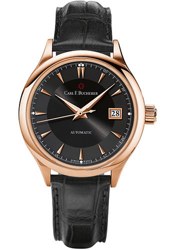 38 mm 18K rose gold case, 10.85 mm thick, sapphire crystal back, sapphire crystal with anti-reflective coating on one side, black dial, Caliber CFB 1966 automatic movement with day of the week, hour, minute, second, date, month and moon phase, approximately 42 h of power reserve, black alligator strap, pin buckle with 18K rose gold . Water resistant to 30 m.