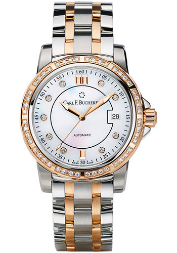 38 mm stainless steel case, 10.85 mm thick, screw down crown, diamond bezel with 48 diamonds 0.75 ct, sapphire crystal with anti-reflective coating on one side, mother of pearl dial, Caliber CFB 1950 automatic movement, approximately 38 h of power reserve, stainless steel bracelet, folding buckle with stainless steel clasp. Water resistant to 50 m.
