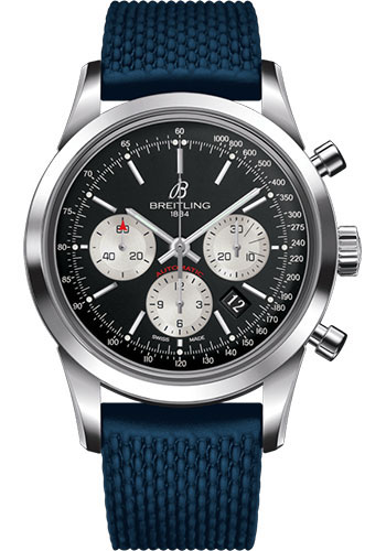 43.00 mm steel case, 14.35 mm thick, transparent sapphire crystal back, non screw-locked crown with two gaskets, convex sapphire crystal with glareproof treatment on both sides, black dial, Breitling 01 (Manufacture) self-winding movement, approximately 70 hrs of power reserve, blue rubber aero classic strap, pushbutton folding buckle. Water resistant to 100 m (330 ft).