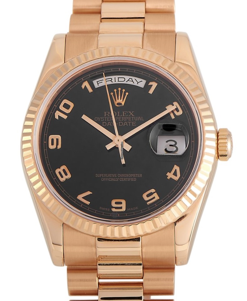 36mm 18K pink gold case, fluted bezel, white dial, stick hour markers, and President bracelet.
