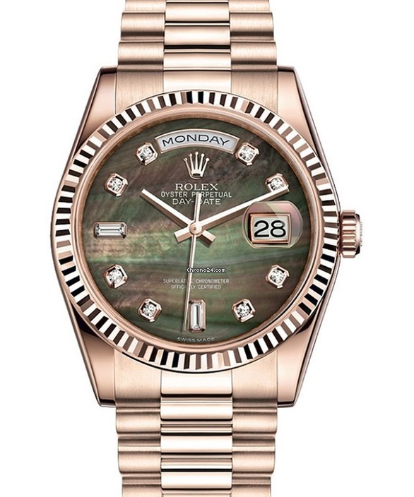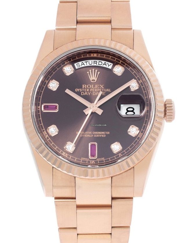 36mm 18K Everose gold case, screw-down back, screw-down crown with twinlock double waterproofness system, fluted bezel, scratch-resistant sapphire crystal with cyclops lens over the date and double anti-reflective coating, chocolate dial, index hour markers, Rolex calibre 3155 automatic movement with rapid setting date and day, 18K Everose gold Oyster bracelet with flat three-piece links, concealed folding Crownclasp buckle. Waterproof to 100 meters.